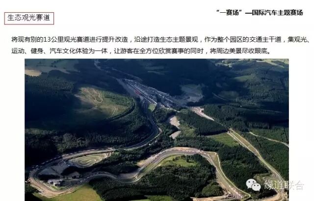 綠道聯合在北京大安山汽車公園的規劃設計項目,重點打造5個板塊,集汽車賽事活動、汽車主題休閑、汽車服務配套,結合區域鄉村農業發展,將汽車主題活動形成園區化、產業化。